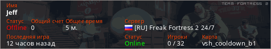 Играет на Team Fortress 2 сервере. Страна: РоссияПервый раз замечен 22:24 29.03.2026