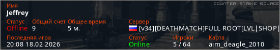Играет на Counter Strike Source сервере. Страна: РоссияПервый раз замечен 20:02 18.02.2026
