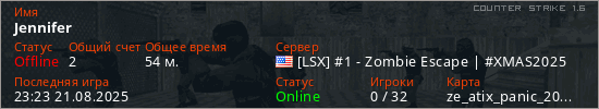 Играет на Counter Strike 1.6 сервере. Страна: СШАПервый раз замечен 22:00 10.08.2025
