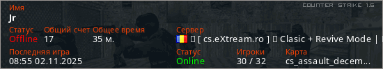 Играет на Counter Strike 1.6 сервере. Страна: РумынияПервый раз замечен 20:58 03.12.2024