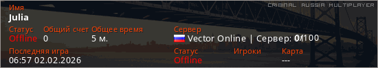 Играет на Criminal Russia Multiplayer сервере. Страна: РоссияПервый раз замечен 06:55 02.02.2026