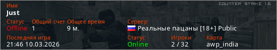 Играет на Counter Strike 1.6 сервере. Страна: РоссияПервый раз замечен 11:43 09.03.2026