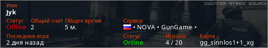 Играет на Counter Strike Source сервере. Страна: РоссияПервый раз замечен 02:38 11.01.2026