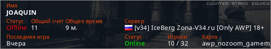 Играет на Counter Strike Source сервере. Страна: РоссияПервый раз замечен 05:46 23.12.2025