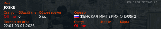 Играет на Counter Strike 1.6 сервере. Страна: РоссияПервый раз замечен 21:59 03.01.2026