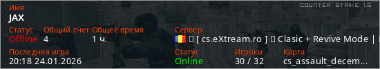 Играет на Counter Strike 1.6 сервере. Страна: РумынияПервый раз замечен 04:46 17.01.2026