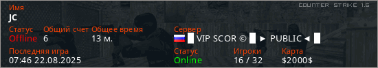 Играет на Counter Strike 1.6 сервере. Страна: РоссияПервый раз замечен 06:33 16.08.2025