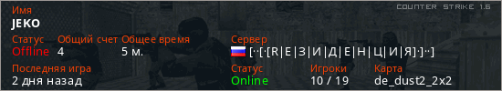 Играет на Counter Strike 1.6 сервере. Страна: РоссияПервый раз замечен 11:35 19.03.2026