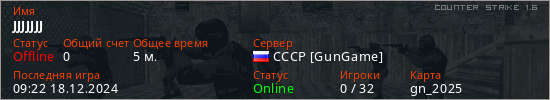 Играет на Counter Strike 1.6 сервере. Страна: РоссияПервый раз замечен 09:20 18.12.2024