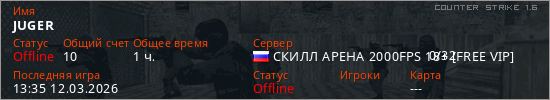 Играет на Counter Strike 1.6 сервере. Страна: РоссияПервый раз замечен 13:15 11.03.2026