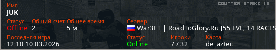 Играет на Counter Strike 1.6 сервере. Страна: РоссияПервый раз замечен 11:57 10.03.2026