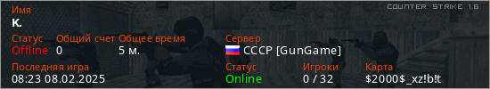 Играет на Counter Strike 1.6 сервере. Страна: РоссияПервый раз замечен 08:21 08.02.2025