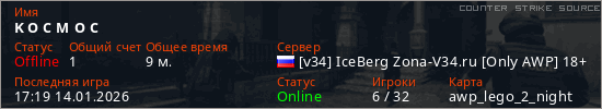 Играет на Counter Strike Source сервере. Страна: РоссияПервый раз замечен 15:55 13.01.2026