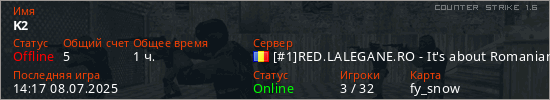 Играет на Counter Strike 1.6 сервере. Страна: РумынияПервый раз замечен 00:40 28.07.2023