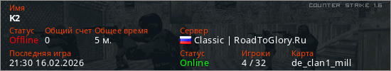 Играет на Counter Strike 1.6 сервере. Страна: РоссияПервый раз замечен 21:28 16.02.2026
