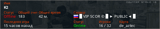Играет на Counter Strike 1.6 сервере. Страна: РоссияПервый раз замечен 14:22 22.12.2025