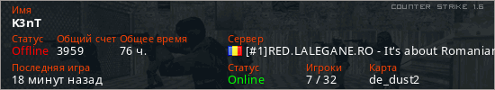 Играет на Counter Strike 1.6 сервере. Страна: РумынияПервый раз замечен 13:37 21.05.2022