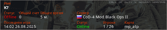 Играет на Call of Duty 4: Modern Warfare сервере. Страна: РоссияПервый раз замечен 13:51 26.08.2025