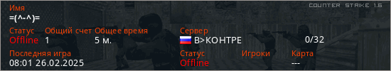 Играет на Counter Strike 1.6 сервере. Страна: РоссияПервый раз замечен 07:55 26.02.2025
