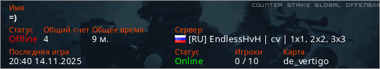 Играет на Counter Strike Global Offensive сервере. Страна: РоссияПервый раз замечен 20:27 07.11.2025