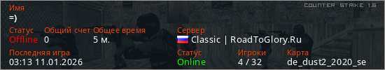 Играет на Counter Strike 1.6 сервере. Страна: РоссияПервый раз замечен 03:06 11.01.2026
