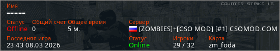 Играет на Counter Strike 1.6 сервере. Страна: РоссияПервый раз замечен 23:40 08.03.2026