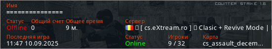 Играет на Counter Strike 1.6 сервере. Страна: РумынияПервый раз замечен 10:51 11.07.2025