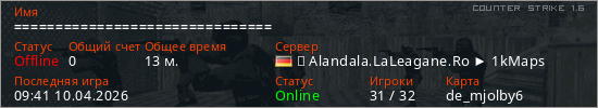 Играет на Counter Strike 1.6 сервере. Страна: ГерманияПервый раз замечен 05:57 10.04.2026