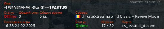 Играет на Counter Strike 1.6 сервере. Страна: РумынияПервый раз замечен 21:54 08.12.2024