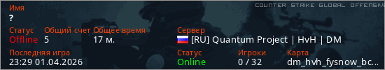 Играет на Counter Strike Global Offensive сервере. Страна: РоссияПервый раз замечен 19:02 28.03.2026
