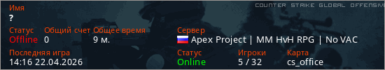 Играет на Counter Strike Global Offensive сервере. Страна: РоссияПервый раз замечен 22:40 20.04.2026