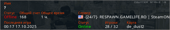 Последний раз был в сети 00:17 17.10.2025 Игрок с таким ником замечен на 72 серверах
