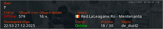 Играет на Counter Strike 1.6 сервере. Страна: РумынияПервый раз замечен 22:31 14.06.2022