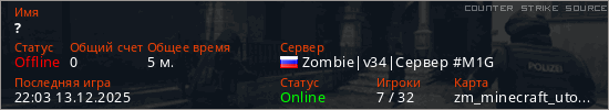 Играет на Counter Strike Source сервере. Страна: РоссияПервый раз замечен 21:57 13.12.2025