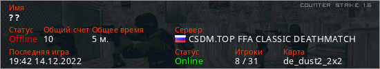 Играет на Counter Strike 1.6 сервере. Страна: РоссияПервый раз замечен 19:40 14.12.2022