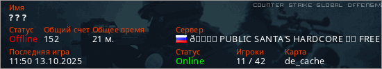 Играет на Counter Strike Global Offensive сервере. Страна: РоссияПервый раз замечен 21:39 02.06.2025