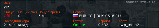 Играет на Counter Strike 1.6 сервере. Страна: РоссияПервый раз замечен 15:10 05.04.2026