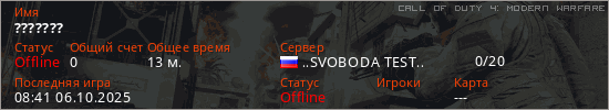 Играет на Call of Duty 4: Modern Warfare сервере. Страна: РоссияПервый раз замечен 08:17 24.09.2025