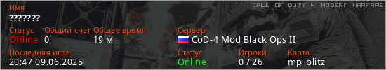 Играет на Call of Duty 4: Modern Warfare сервере. Страна: РоссияПервый раз замечен 19:47 29.12.2024