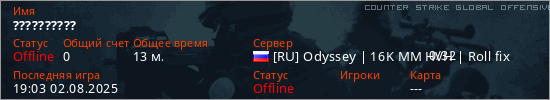 Играет на Counter Strike Global Offensive сервере. Страна: РоссияПервый раз замечен 01:40 02.08.2025
