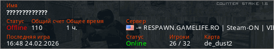 Играет на Counter Strike 1.6 сервере. Страна: СШАПервый раз замечен 17:20 20.02.2026