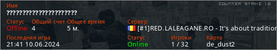 Играет на Counter Strike 1.6 сервере. Страна: РумынияПервый раз замечен 21:39 10.06.2024