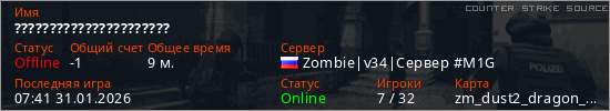 Играет на Counter Strike Source сервере. Страна: РоссияПервый раз замечен 07:20 31.01.2026