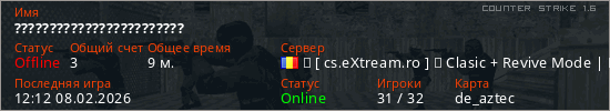 Играет на Counter Strike 1.6 сервере. Страна: РумынияПервый раз замечен 12:51 07.02.2026