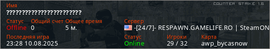 Играет на Counter Strike 1.6 сервере. Страна: СШАПервый раз замечен 23:26 10.08.2025