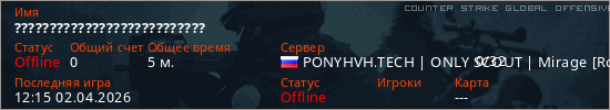 Играет на Counter Strike Global Offensive сервере. Страна: РоссияПервый раз замечен 12:07 02.04.2026