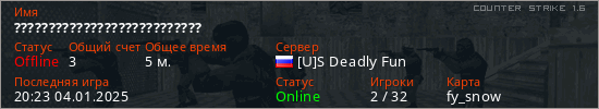 Играет на Counter Strike 1.6 сервере. Страна: РоссияПервый раз замечен 20:02 04.01.2025