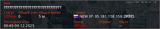 Играет на Counter Strike 1.6 сервере. Страна: РоссияПервый раз замечен 09:40 09.12.2025