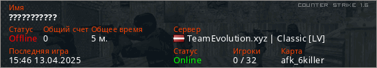 Играет на Counter Strike 1.6 сервере. Страна: ЛатвияПервый раз замечен 15:44 13.04.2025