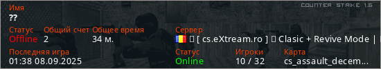 Играет на Counter Strike 1.6 сервере. Страна: РумынияПервый раз замечен 16:13 06.11.2024